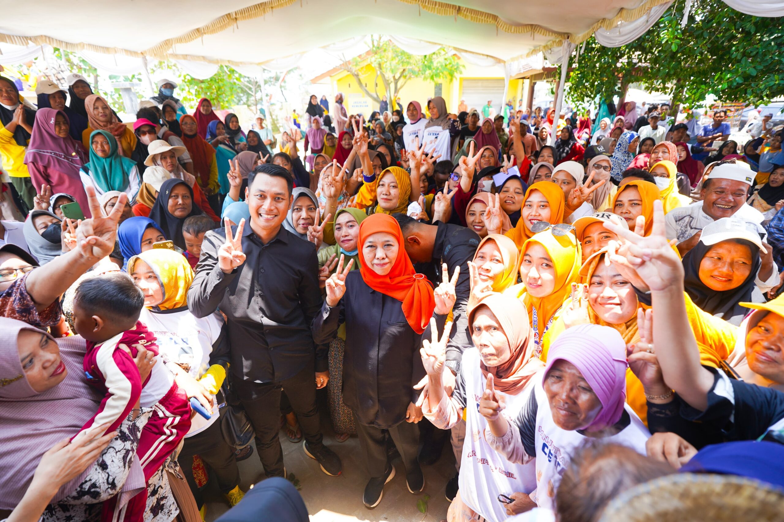 Para ibu-ibu, pedagang spontan ikut berjoget mengacungkan dua jari dan bernyanyi bersama Khofifah mendukung dan mendoakan kemenangan Khofifah-Emil.