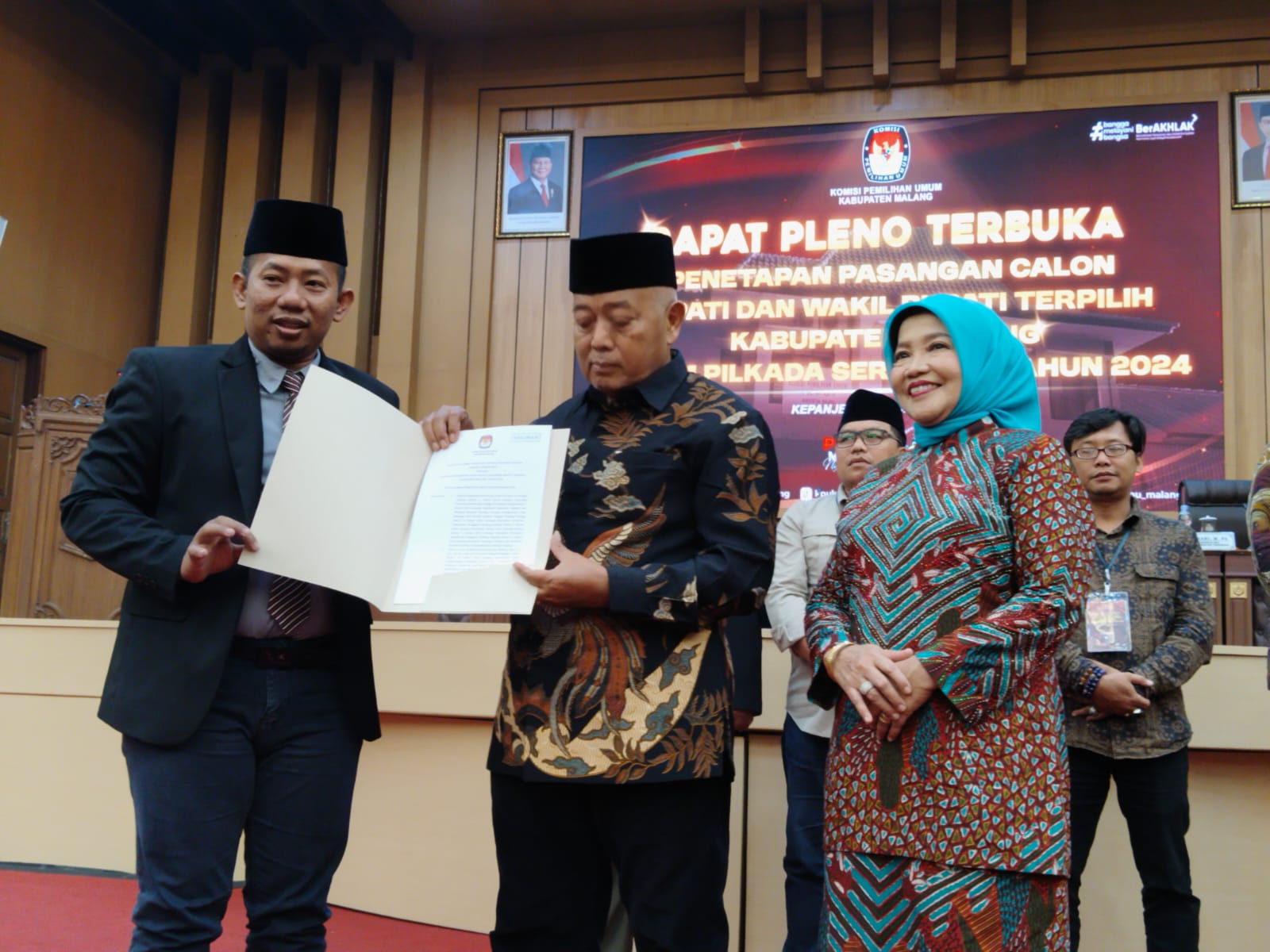 MALANG, AIAMews.id – Komisi Pemilihan Umum ( KPU) Kabupaten Malang pada Kamis (6/2) lakukan rapat pleno terbuka, penetapan pasangan calon bupati terpilih pada Pilkada serentak 27 Nopember 2024 lalu. Pasangan calon terpilih no urut 1 yaitu Drs. H.M. Sanusi sebagai bupati dengan Hj. Lathifah Shohib sebagai wakil bupati.
