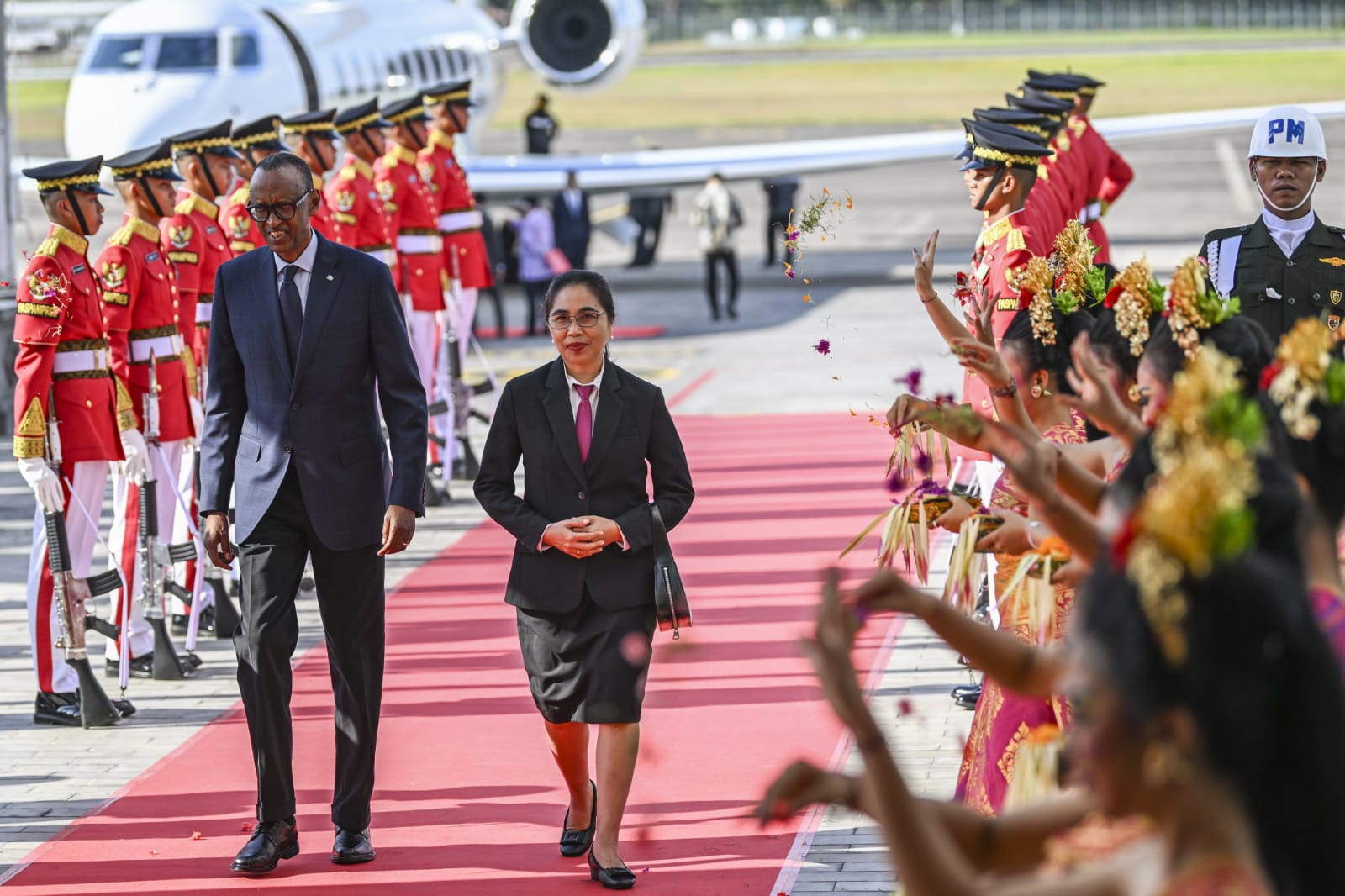 Rwanda Paul Kagame mendarat di Bandara Internasional I Gusti Ngurah Rai, Badung, Bali didampingi Direktur Rumah Sakit Jiwa Provinsi Bali Ni Wayan Murdani disambut dengan tarian khas Bali.