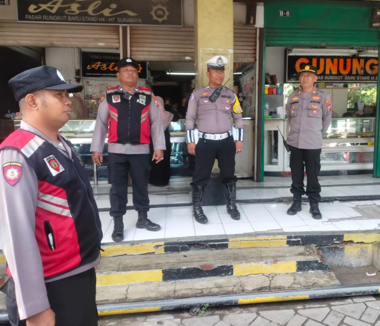 Wakapolsek Rungkut, AKP Hairul Anwar, bersama Pawas Aiptu Eko Santoso dan Piket Fungsi, turun langsung ke lapangan untuk memantau situasi dan berkoordinasi dengan para pemilik toko.