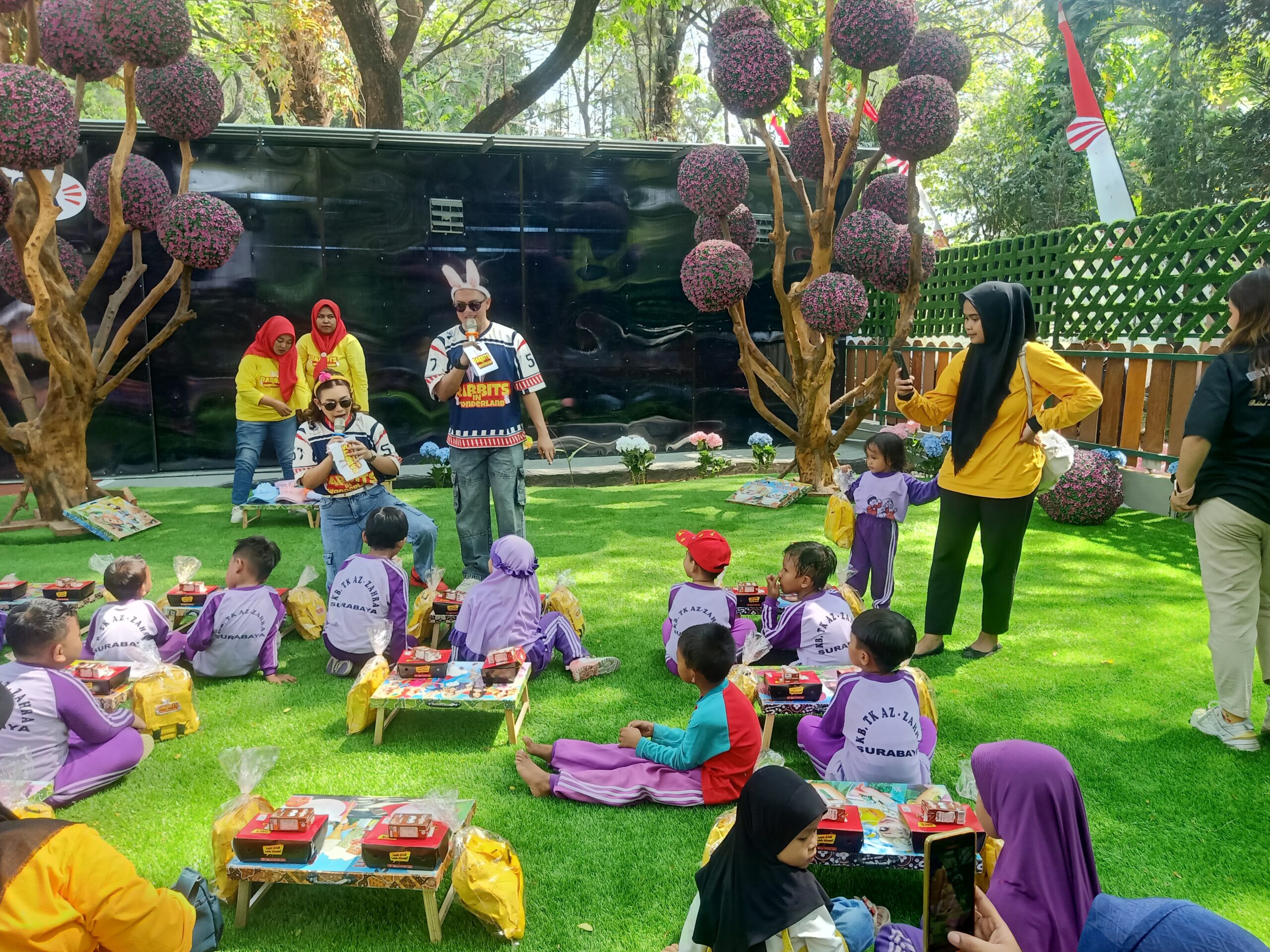 Sejak dibuka, area Rabbits in Wonderland (RIW) langsung dipenuhi gelak tawa dan keceriaan.Anak-anak dari TK AZ-ZAHRA ini tampak sangat gembira bisa berinteraksi langsung, memberi makan, dan membelai aneka jenis kelinci yang dilepas di taman bermain yang didesain ramah anak dan edukatif.