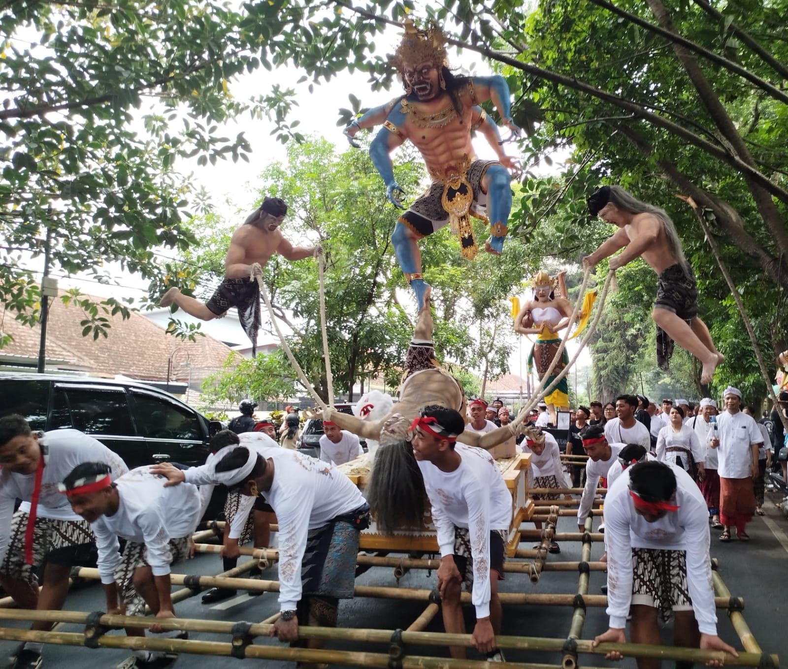 Empat Ogoh-Ogoh diarak keliling ke jalanan, dengan start dan finish di lapangan Rampal Malang. Usai diarak, Ogoh Ogoh kembali ke Lapangan Rampal, kemudian dibakar.